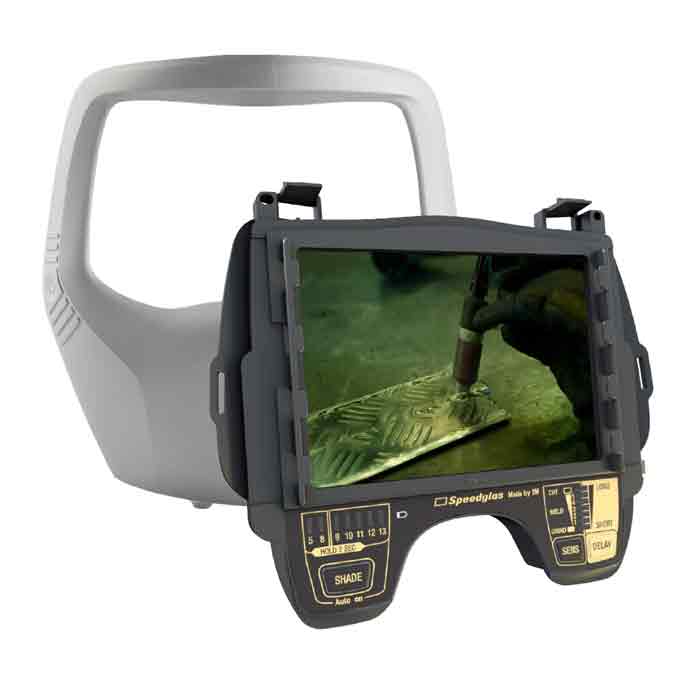 Kit mit Schweißfilter und neu gestaltetem  silbernen Hitzeschild mit Zugriff von außen auf die voreingestellten Schweißmodi und die Einstellung eines Schleifmodus