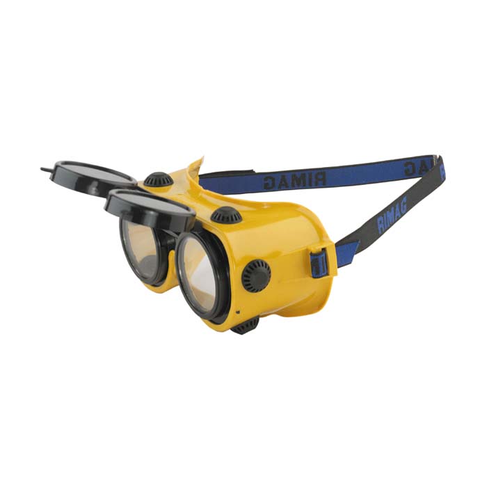 Hochklappbare Korbbrille, Gelb/Schwarz. Leichter Glastausch durch Schraubringe, Kopfband verstellbar, geeignet zum Tragen über Korrektionsbrillen.