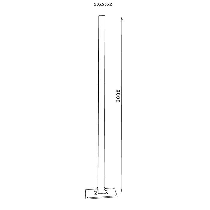 Ständer, Höhe 3.000 mm zum Aufbauen von Kabinen bzw. Abtrennungen mit Vorhängen oder Lamellen. Aus Vierkantprofil 50 x 50 x 2 mm, mit Fußplatte 110 x 110 x 8 mm. Grau, RAL 7035 pulverbeschichtet.