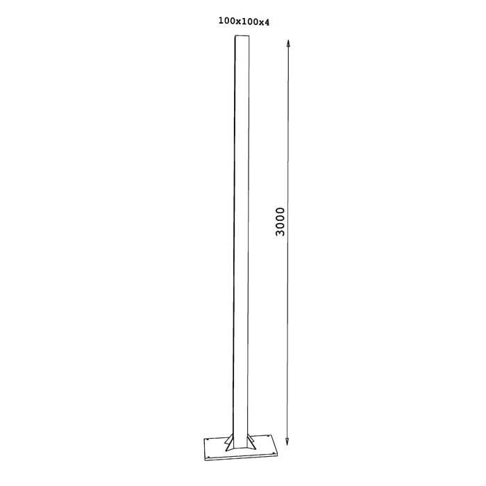 Ständer, Höhe 3.000 mm. Aus Vierkantprofil 100 x 100 x 4 mm, mit Fußplatte 500 x 500 x 15 mm. Grau, RAL 7035 pulverbeschichtet. Zur Befestigung von Schwenkarmen (max. Breite 300 cm) mit Lamellenvorhang (max. Höhe 250 cm).