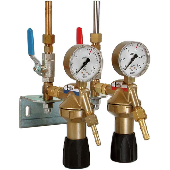 Entnahmestellenstation zweifach für Propan und Sauerstoff, kpl. mit Druckminderer, Kugelhahn, Wandkonsole, Löt- bzw. Schweißstutzen 3/8", Überwurfmutter 3/8". Wandwinkel und Kugelhahn werden bauseits montiert.
