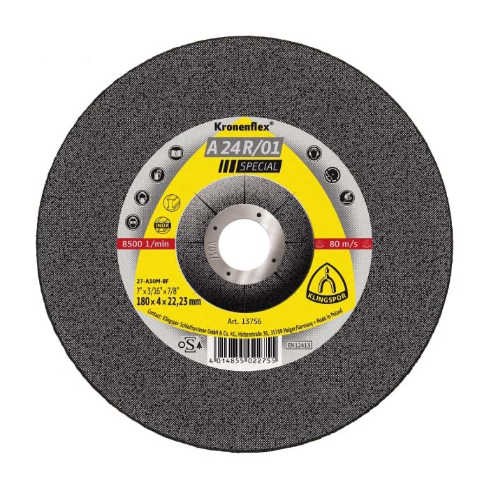 Schruppscheibe A 24 R/01 Special. Mittlere Härte. Spezialscheibe für den Pipeline- und Behälterbau, Schweißnahtbearbeitung im Stirnschliff, Ausschleifen von Schweißfehlern oder Wurzelnähten. Hochleistungsprodukt für spezielle Anwendungen in Industrie und Handwerk.